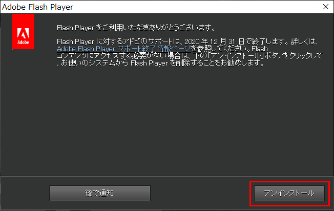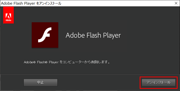 Adobeサイト>Flash Player (Windows)のアンインストール