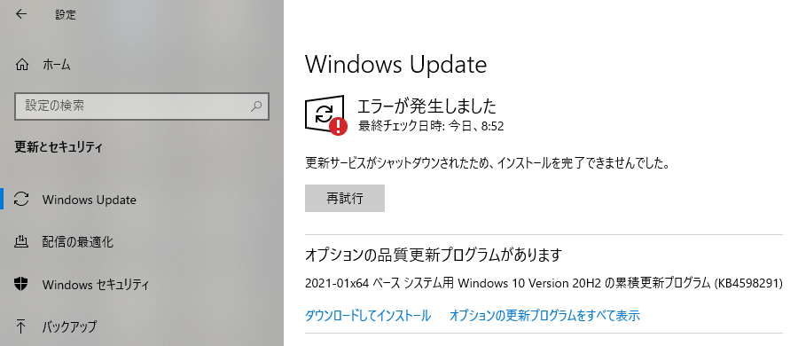 「更新サービスがシャットダウンされたため、インストールを完了できませんでした。」