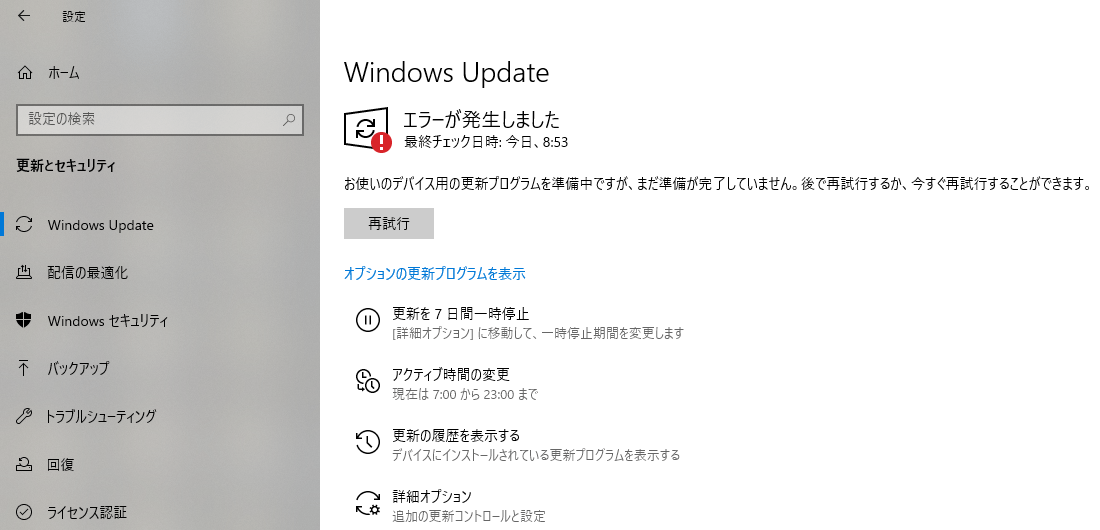 「お使いのデバイス用の更新プログラムを準備中ですが、まだ準備が完了していません。後で再試行するか、今すぐ再試行することができます。」